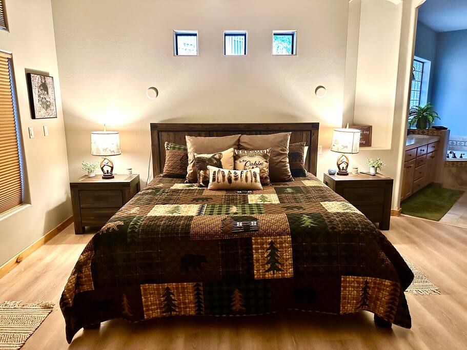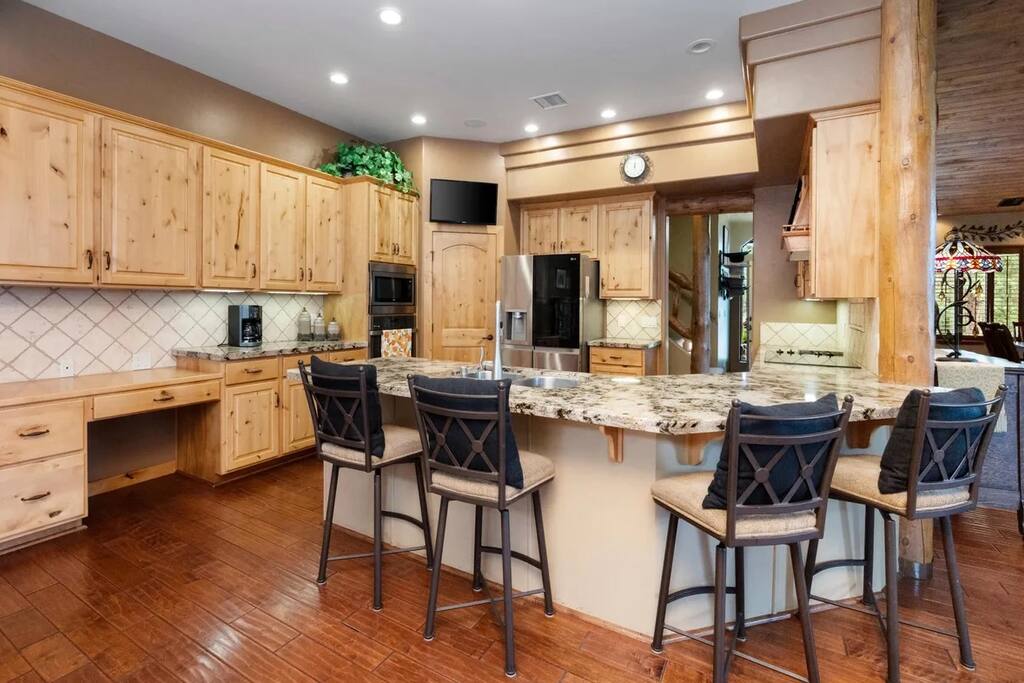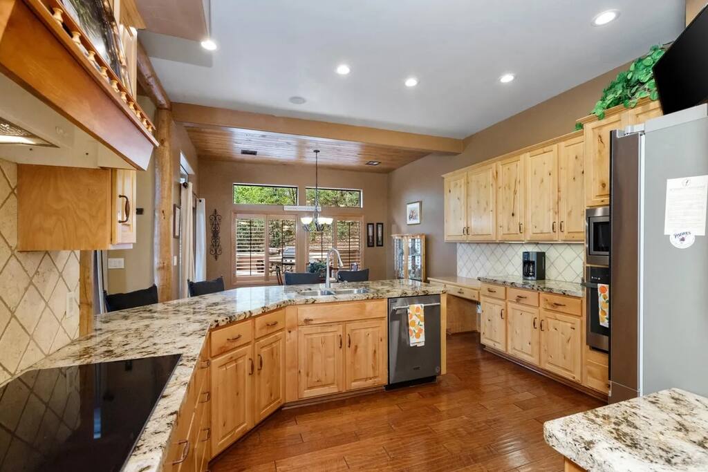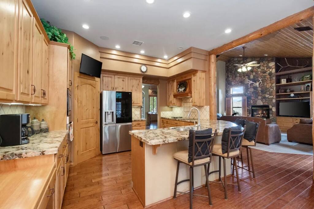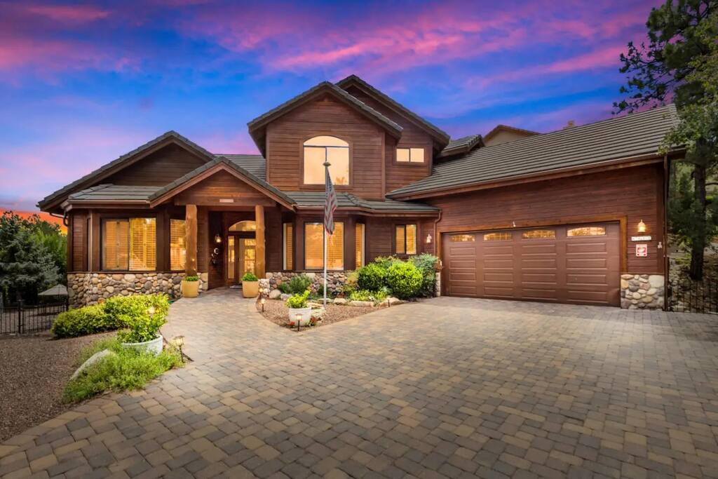 Welcome to Timberline Retreat – Your Favorite Prescott Rental! Nestled in the upscale Kingwood Estates and just 10 minutes from historic downtown Prescott, Timberline Retreat is a spacious and beautifully furnished home designed for comfort, fun, and relaxation. Whether you're planning a family getaway, group retreat, or extended midterm stay, this 5-bedroom, 4-bathroom retreat offers everything you need — and more. Property Highlights: * Sleeps up to 12 guests with 7 comfortable beds * 3,200 sq ft of stylish living space * Kid-friendly game room with pool table & classic Pac-Man arcade * Spacious outdoor area with fireplace, BBQ grill, and cozy seating * Attached 2-car garage * Located in a quiet, upscale neighborhood Bedrooms: * Main Floor Master Suite: King bed, fireplace, TV, dresser, luxurious ensuite with double sinks, soaking tub, and walk-in shower. * Bedroom 2: Queen bed with dresser and closet * Bedroom 3: Queen bed with private ensuite bath * Bedroom 4: Queen-over-queen bunk bed * Bedroom 5/Game Room: Two twin beds, TV, and cozy couch – great for kids or teens Kitchen & Living: * Fully stocked gourmet kitchen * Open-concept living and dining area * Smart TVs and fast Wi-Fi Entertainment: * Pool table * Pac-Man arcade game * Games for all ages * Outdoor fireplace, table, grill, and string lights for evenings under the stars Note: Please note this home is located in an HOA and has to abide by city ordinances. Please read the additional information section in it’s entirety before you book.